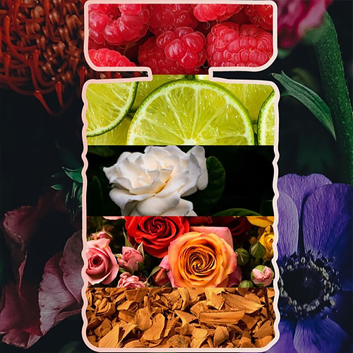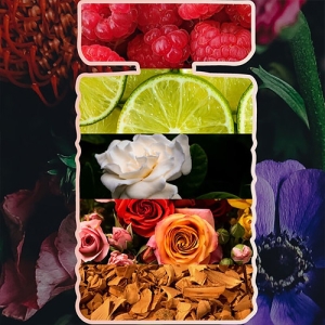 Illatjegyek: bergamott, mandarin, málna, rózsabors, gardénia, rózsa, ylang-ylang, arab jázmin, vanília orchidea, ámbrafa, szantálfa, pacsuli